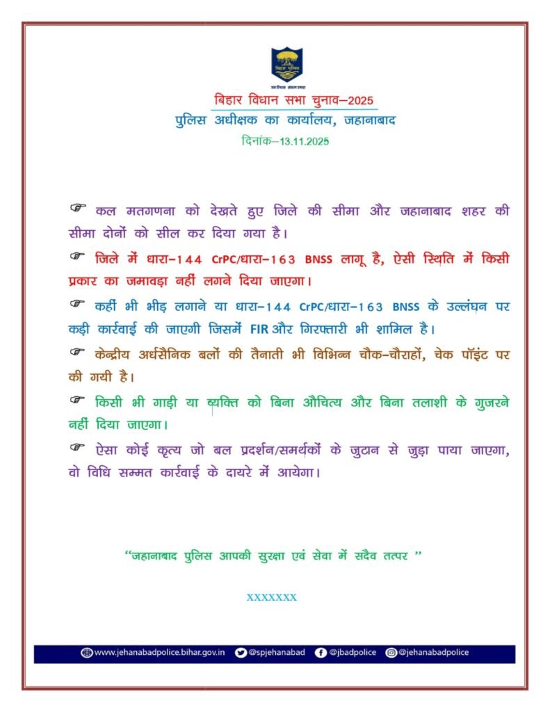पुलिस अधीक्षक विनीत कुमार ने जानकारी देते हुए बताया कि मतगणना को लेकर जिले में धारा 144 लागू हो गया है। वही जिले को सील कर दिया गया है।सुरक्षा को लेकर सभी स्थानों पर पुलिस बल की तैनाती की गई है। वही उन्होंने बताया कि धारा 144 लागू हैं वैसी स्थिति में जमावाड़ा लगाने पर प्रतिबंध लगा दी गई है। भीड़ इकट्ठा होने के फलस्वरूप प्राथमिकी दर्ज कर गिरफ्तारी भी हो सकती है। वही उन्होंने बताया कि सभी चौक चौराहों, एवं चेक पोस्ट पर केंद्रित अर्ध सैनिक बलों की तैनाती की गई है।आम लोगों से अपील किया गया है कि वे वजह भीड़ इकट्ठा न करें, तथा चेक पोस्ट पर गाड़ी की तलाशी के उपरांत ही गुजरने दिया जाएगा।