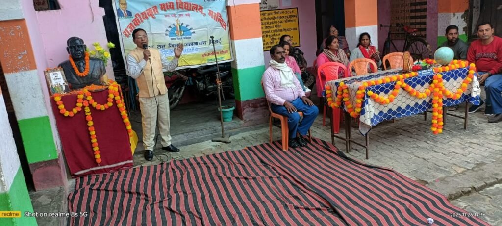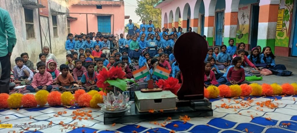 राजकीय मध्य विद्यालय के प्रधानाचार्य डॉ अरविंद चौधरी ने बताया कि संविधान हमारी शान है ,हम सबों की पहचान है ,नियम और कानून का यह सर्वोच्च विधान है। उपस्थित शिक्षकों ने संविधान दिवस की हार्दिक बधाई एवं शुभकामनाएं दी ,तथा समस्त विद्यालय परिवार द्वारा सामूहिक रूप से संविधान की प्रस्तावना को दोहराई गई। वही प्रधानाध्यापक डॉ. अरविंद चौधरी ने कहा कि संविधान है तो हमलोग हैं। संविधान में निहित मौलिक अधिकार और कर्तव्यों को पालन करना हम लोगों का परम कर्तव्य है। साथ ही सभी छात्र/छात्राओं को संदेश देते हुए कहा कि आप लोग भी कड़ी परिश्रम और मेहनत लगन से पढ़े लिखे आगे बढ़े और बाबा साहेब की तरह विश्व विद्वान बनकर परिवार, समाज और देश के विकास में अपना अहम योगदान देंगे। इस मौके पर छात्र/छात्राओं ने एक से बढ़कर एक भाषण, गीत- संगीत एवं अभिनय की प्रस्तुति देकर कार्यक्रम में चार चांद लगा दिए, वहीं शिक्षिका प्रीति पांडेय मैडम ने भी संगीत की प्रस्तुति से समां बांध दिए । इस महती कार्यक्रम को संबोधित करने वालों में प्रधानाध्यापक डॉ. अरविंद चौधरी ,सहायक शिक्षक अरुण कुमार सिंह, रानी अर्पणा, शीला कुमारी, सरिता कुमारी, सुनीता कुमारी, प्रीति पांडेय, सतीश सुंदरपुरी ,ऋषिकांत कुमार, विभा वर्मा, श्याम कुमार, गंगा पासवान समेत समस्त विद्यालय परिवार।