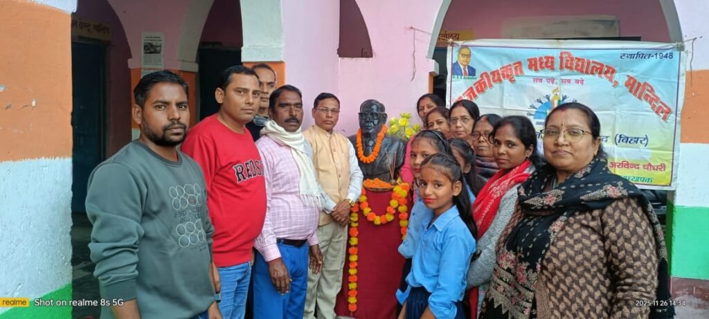 जहानाबाद -जिले के रा.मध्य विद्यालय मांदिल के प्रांगण में भव्य संविधान दिवस का आयोजन हुआ ,जिसकी अध्यक्षता संबंधित प्रधानाध्यापक डॉ. अरविंद चौधरी ने किया ।उक्त मौके पर समस्त विद्यालय परिवारों ने प्रांगण में स्थित बाबा साहेब के प्रतिमा पर माल्यार्पण एवं संविधान की प्रति पर पुष्पांजलि अर्पित करते हुए सादर नमन किया एवं लोगों ने संविधान दिवस पर अपना अपना बहुमूल्य विचार करते हुए संविधान को अक्षुण्ण बनाए रखने की शपथ ली।