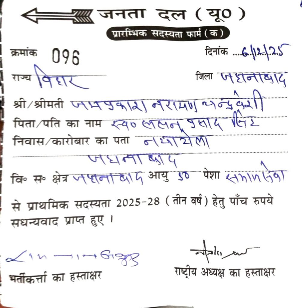 06 दिसंबर 2025जनता दल (यूनाइटेड) के व्यापक सदस्यता अभियान के अंतर्गत आज पटना स्थित पार्टी मुख्यालय में एक महत्वपूर्ण कार्यक्रम आयोजित किया गया। इस अवसर पर केंद्रीय कृषि एवं किसान कल्याण राज्य मंत्री की उपस्थिति में जहानाबाद के पूर्व जिला अध्यक्ष एवं सासाराम क्षेत्र के हालिया चुनाव प्रभारी जयप्रकाश नारायण चंद्रवंशी ने जदयू की प्राथमिक सदस्यता ग्रहण की।श्री चंद्रवंशी वर्तमान में पार्टी की प्रदेश राजनीतिक सलाहकार समिति के सदस्य हैं ,और जदयू के संस्थापन काल से सक्रिय भूमिका निभाते रहे हैं। सदस्यता ग्रहण करने के उपरांत उन्होंने कहा कि वे माननीय मुख्यमंत्री नीतीश कुमार के नेतृत्व में बिहार के समग्र विकास तथा पार्टी की विचारधारा के प्रति पूर्ण निष्ठा से कार्य करते रहेंगे। उन्होंने कहा,