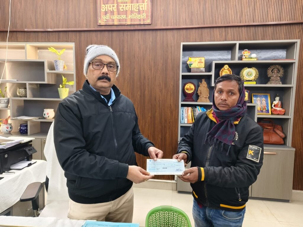 पश्चिम बंगाल राज्य के पूर्व वर्द्धमान जिला में बीते 15 अगस्त 2025 को सड़क दुर्घटना में पूर्वी चम्पारण के 11 व्यक्तियों की मृत्यु हो गई थी। 35 लोग घायल हो गए थे। इस घटना के बाद मुख्यमंत्री ने प्रत्येक मृतक के परिजनों को 2 लाख रुपए तथा घायलों को 50 हजार रुपए मुख्यमंत्री राहत कोष से अनुदान देने की घोषणा की थी। इसके आलोक में जिला आपदा प्रबंधन शाखा ने लाभुकों के बीच कुल 39 लाख 50 हजार के अनुग्रह अनुदान के भुगतान के लिए आज अपर समाहर्ता मुकेश कुमार सिन्हा ने चेक वितरण किया l इस अवसर पर सहायक आपदा प्रबंधन पदाधिकारी अखिलेश कुमार भी उपस्थित रहे!
