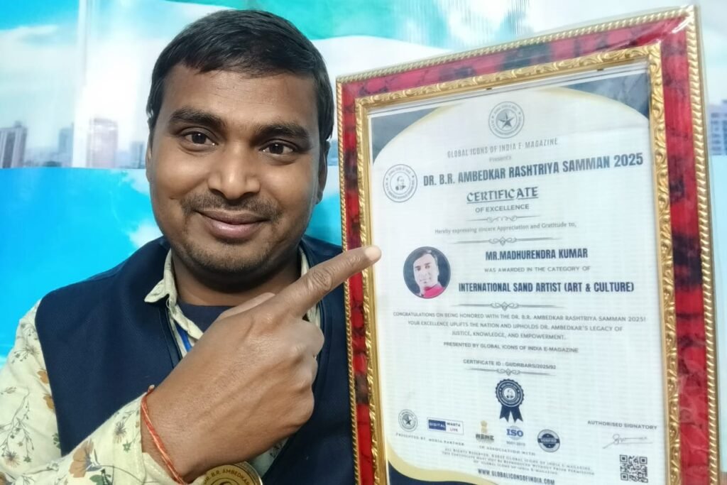 भारतीय कला और संस्कृति के क्षेत्र में उल्लेखनीय एवं अमूल्य योगदान के लिए देश-विदेश में चर्चित अंतरराष्ट्रीय रेत कलाकार मधुरेंद्र कुमार को वर्ष 2025 का डॉ. बी. आर. अंबेडकर राष्ट्रीय सम्मान प्रदान किया गया है। यह सम्मान ग्लोबल आईकॉन ऑफ इंडिया ई-मैगजीन की ओर से प्रमाण पत्र संख्या जी II/डीबीआरबीएआरएस /2025/92 के अंतर्गत दिया गया।