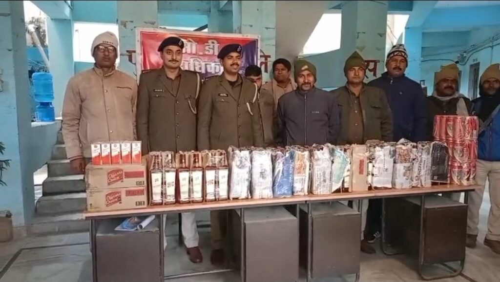 जिले के कोटवा थाना पुलिस ने अंग्रजी शराब के साथ एक कारोबारी को गिरफ्तार किया है।कोटवा थाना के अमवा गांव में नव निर्मित मकान में बने हुए तहखाना में शराब छुपाकर रखा गया था। जब्त शराब की कुल मात्रा 98.28 लीटर है। जिसमें 750 एम एल का 84 पीस आरएस ब्रांड का, 96 पीस फ्रूटी ऑफिसर चॉइस का व 36 पीस बियर किंगफिशर का शामिल है। गिरफ्तार कारोबारी कोटवा थाना के अमवा गांव का निवासी आकाश कुमार है। कारोबारी अपने गांव में आलीशान मकान बना रहा है।