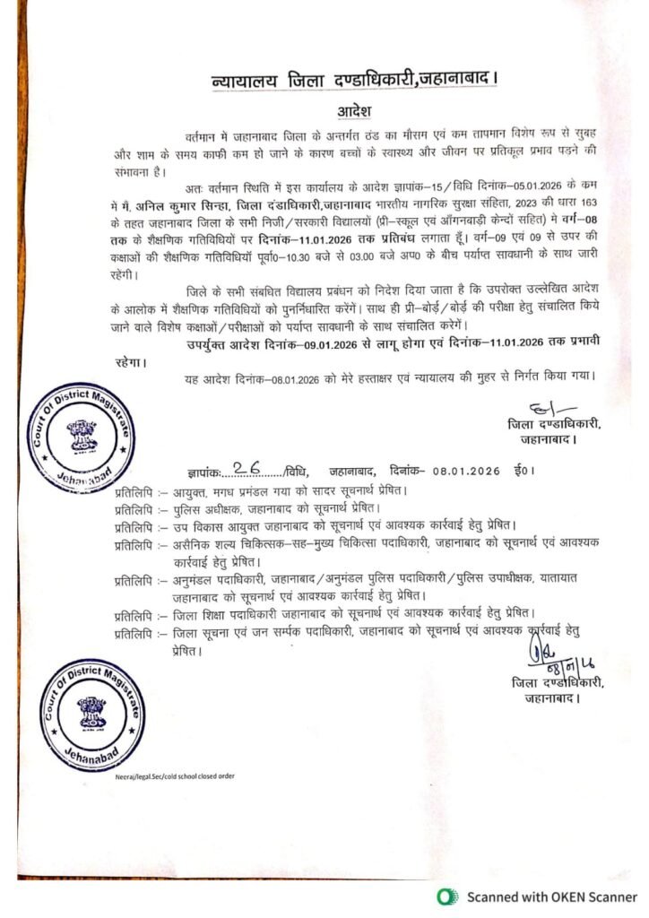 जहानाबाद -जिला पदाधिकारी ने जिले में पड़ रही कड़ाके की ठंड एवं शीत लहर के प्रकोप से सरकारी एवं निजी स्कूल आगामी 11 जनवरी तक बंद रखने का आदेश निर्गत किया है।