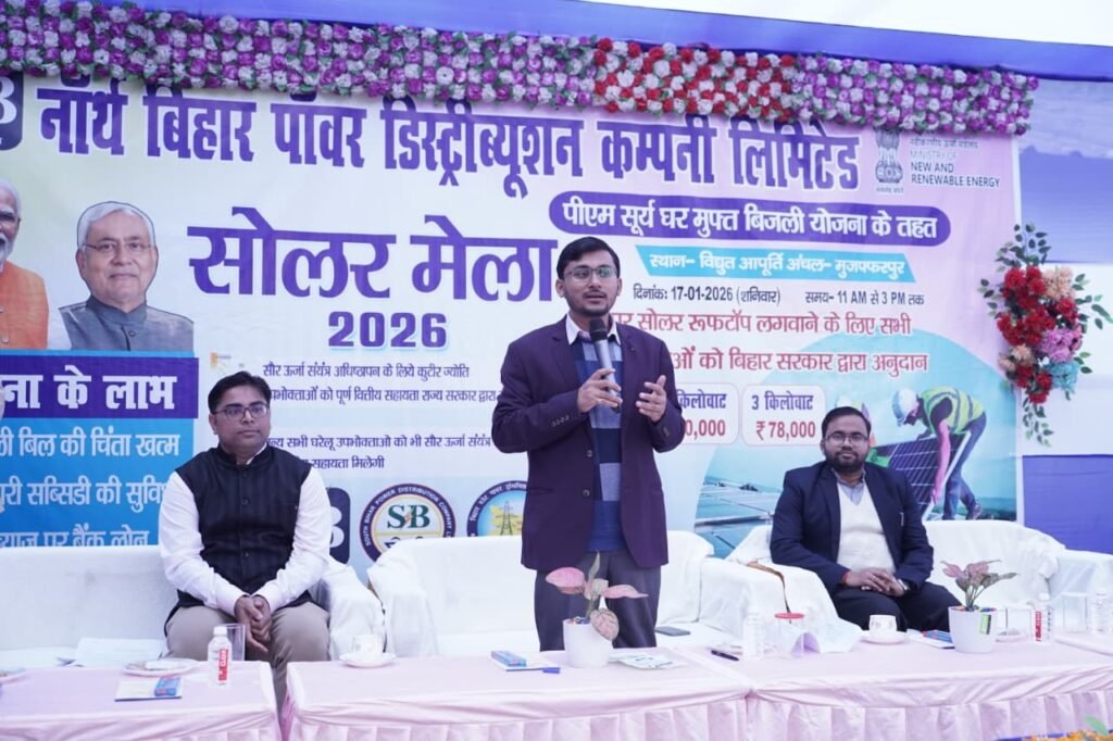 पी.एम. सूर्य घर: मुफ्त बिजली योजना के प्रभावी क्रियान्वयन, उपभोक्ता जागरूकता तथा आवेदन से इंस्टॉलेशन के बीच की अड़चनों को दूर करने के उद्देश्य से 17 जनवरी 2026 को NBPDCL मुज़फ्फरपुर सर्किल कार्यालय परिसर में “सोलर मेला” का आयोजन किया गया। इस मेले में जिला प्रशासन, MNRE, डिस्कॉम, बैंक एवं पंजीकृत सोलर वेंडरों की सक्रिय भागीदारी रही।