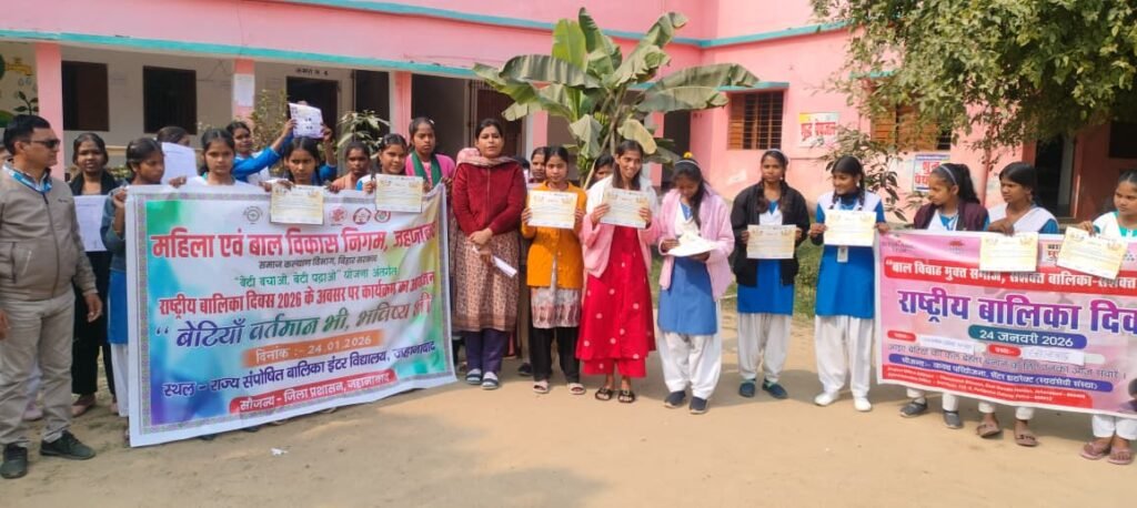 जहानाबाद -जिला पदाधिकारी अनिल कुमार सिन्हा के निर्देशानुसार आज दिनांक 24 जनवरी, 2026 को राष्ट्रीय बालिका दिवस के अवसर पर राज्य संपोषित इंटर बालिका विद्यालय, जहानाबाद में जिला हब फॉर एंपावरमेंट ऑफ विमेन के तत्वावधान में एक जागरूकता कार्यक्रम का आयोजन किया गया। कार्यक्रम का उद्देश्य बालिकाओं के अधिकार, शिक्षा, समान अवसर तथा उनके सशक्तिकरण के प्रति समाज में जागरूकता फैलाना था।