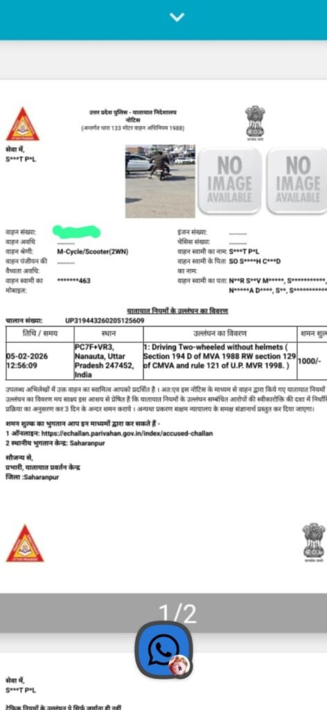 नगर निवासी एक व्यक्ति बाइक पर सवार होकर गंगोह मार्ग से देवबंद मार्ग पर एक शादी समारोह मे दावत खाने गया था, जैसे ही बाइक सवार ने शादी मे खाने के लिए प्लेट उठाई तो मोबाइल मे मैसेज आया ओर 1000 ₹ का बाइक का चालान कट गया। नानौता पुलिस ने बाइक सवार का संजय चौक पर बिना हेलमेट के चालान काट दिया ओर बाइक सवार को बताया भी नही।