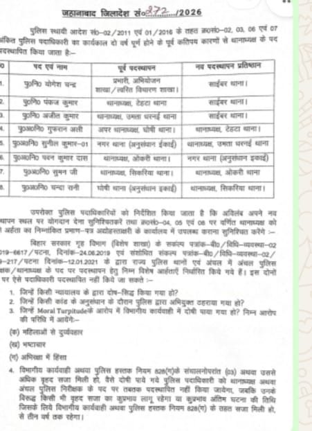 उन्होंने अपने आदेश संख्या 270 एवं 271 दिनांक 5/3/26 के अनुसार थाने में पदस्थापित पुलिस पदाधिकारियों को विधी व्यवस्था को सुदृढ़ करने एवं पारदर्शी बरतने के उद्देश्य से किया गया है। हालांकि कई वैसे भी पुलिस पदाधिकारी जो अनुसंधान कर्ता थे,, उन्हें विधी व्यवस्था में बदलाव किया गया है। वहीं जिनकी तैनाती डायल 112 पर था उन्हें या तो अनुसंधान कर्ता या विधी व्यवस्था का कमान सौंपी गई है। हालांकि नगर थाना में पदास्थापित चर्चित स अ नि लव कुमार को परसबिगहा में स्थानांतरित किया गया है, वहीं शकूराबाद थाना में पदस्थापित स अ नि रामचन्द्र प्रसाद को नगर थाना में जगह मिली है।