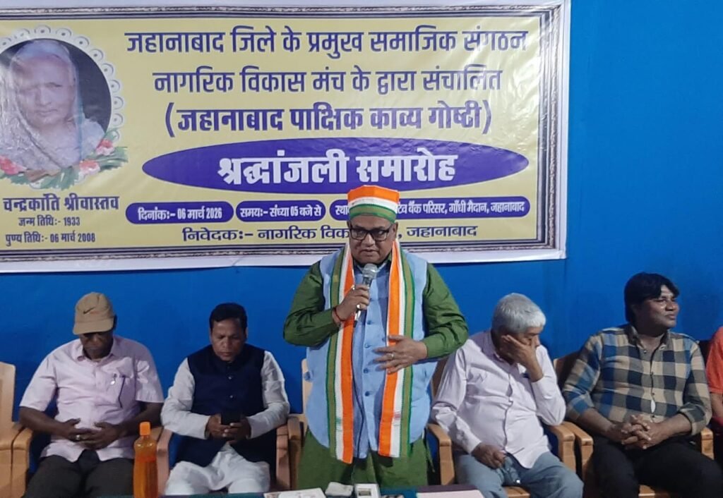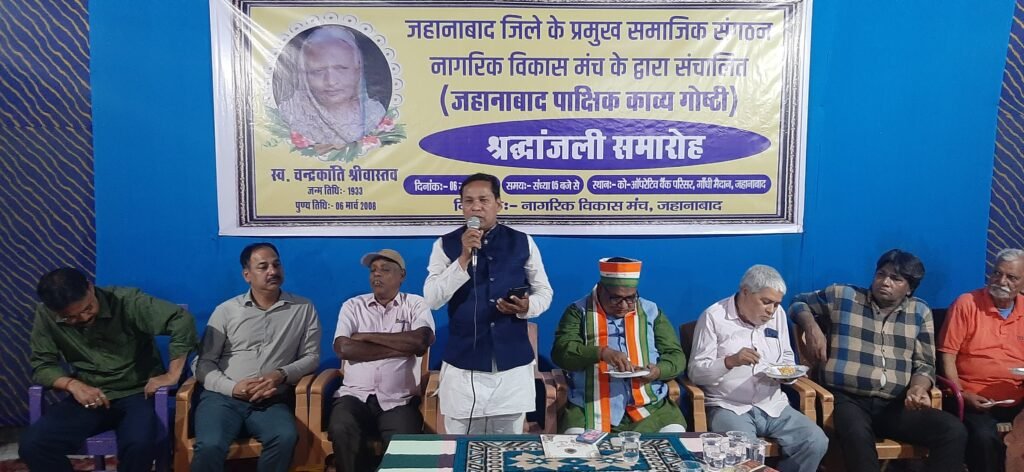 जहानाबाद -नागरिक विकास मंच की पाक्षिक काव्य गोष्ठी इस बार कुछ अलग ही रंग में सजी। मंच पर कविता थी, सुर थे, और यादों की ऐसी हल्की चुभन भी थी, जो दिल को नम कर दे। अवसर था जिले के वरिष्ठ पत्रकार एवं सामाजिक सरोकारों से जुड़े संतोष श्रीवास्तव की माताजी स्व. चन्द्रकांति श्रीवास्तव जी की 18वीं पुण्यतिथि का, जिसे साहित्य और संगीत के साथ श्रद्धांजलि याद किया गया।