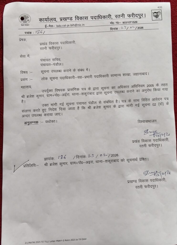 हालांकि प्रखंड विकास पदाधिकारी रतनी फरीदपुर ने अपने पत्रांक 186 दिनांक 23/2/26 के द्वारा पंचायत सचिव ग्राम पंचायत पंडौल को दो दिनों में सुचना उपलब्ध कराने का आदेश निर्गत किया था, परंतु एक माह बितने के उपरांत भी सुचना उपलब्ध न कराना,वरिय पदाधिकारी का आदेश उलंघन करने तथा आदेश का अवहेलना है।