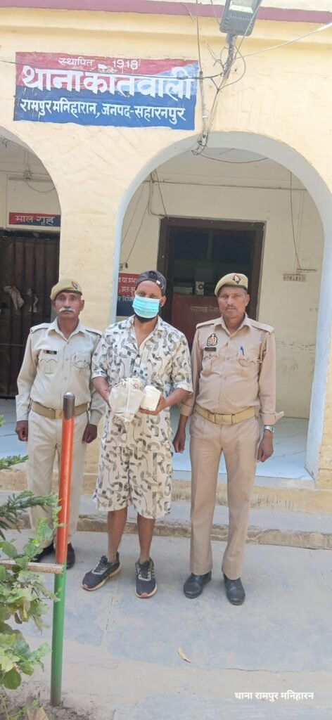 वरिष्ठ पुलिस अधीक्षक सहारनपुर के निर्देशन में नशीले पदार्थों की तस्करी पर रोक लगाने के लिए चलाए जा रहे अभियान के तहत पुलिस अधीक्षक नगर व क्षेत्राधिकारी नकुड़ के पर्यवेक्षण में तथा थानाध्यक्ष राधेश्याम यादव के नेतृत्व में यह कार्रवाई की गई। पुलिस टीम ने मंगलवार को वीवीआईपी कार्यक्रम और डॉ. भीमराव अंबेडकर जयंती के मद्देनजर क्षेत्र में चेकिंग व गश्त के दौरान ग्राम गंगाराम स्थित एक निर्माणाधीन मकान से मंजीत सिंह पुत्र मदनलाल को गिरफ्तार किया। तलाशी लेने पर उसके पास से 17 टेट्रा पैक महबूबा ब्रांड की देशी शराब बरामद हुई। इस संबंध में थाना रामपुर मनिहारान पर आरोपी के खिलाफ आबकारी अधिनियम की धारा 60 के तहत मुकदमा दर्ज कर लिया गया है। पुलिस ने आरोपी को न्यायालय के समक्ष पेश करने की कार्रवाई शुरू कर दी है।