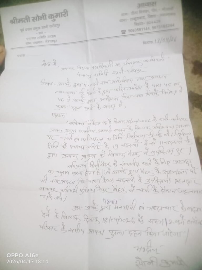 प्रखंड प्रमुख का पक्षपात करने सहित अन्य आरोप का दिया हवाला।